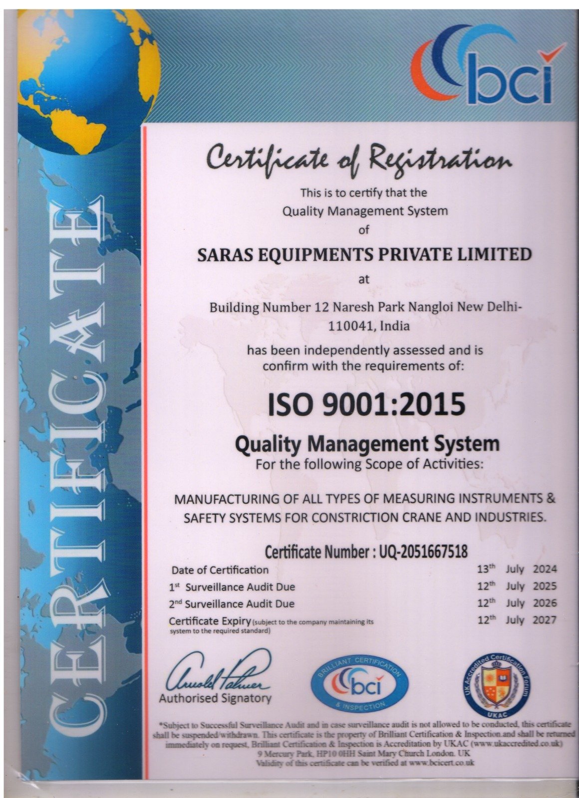 Incepted in the year 2010 at Delhi, India, we SARAS EQUIPMENTS PRIVATE LIMITED are an ISO 9001:2015 company and distinguished Manufacturer and Supplier of Load Indicator and Measurements Products. Apart from this, we are also renowned as the Service Provider of Covering areas like Construction Site & Industries. Our product and service range comprises Safe load indicator parts, Customized Software Development, Digital indicator, Universal testing machine, Impact Testing Machine, Torsion Testing Machines, Shear Beam Load Cells and Shank Hook. Our organization has years of experience in providing load indicator, measurements products & Services. We are an ISO 9001:2015 company with World-Class standards such as Complete integrated solution approach, Quality Management Systems for all processes and experienced, skill based technical resources & trainers.