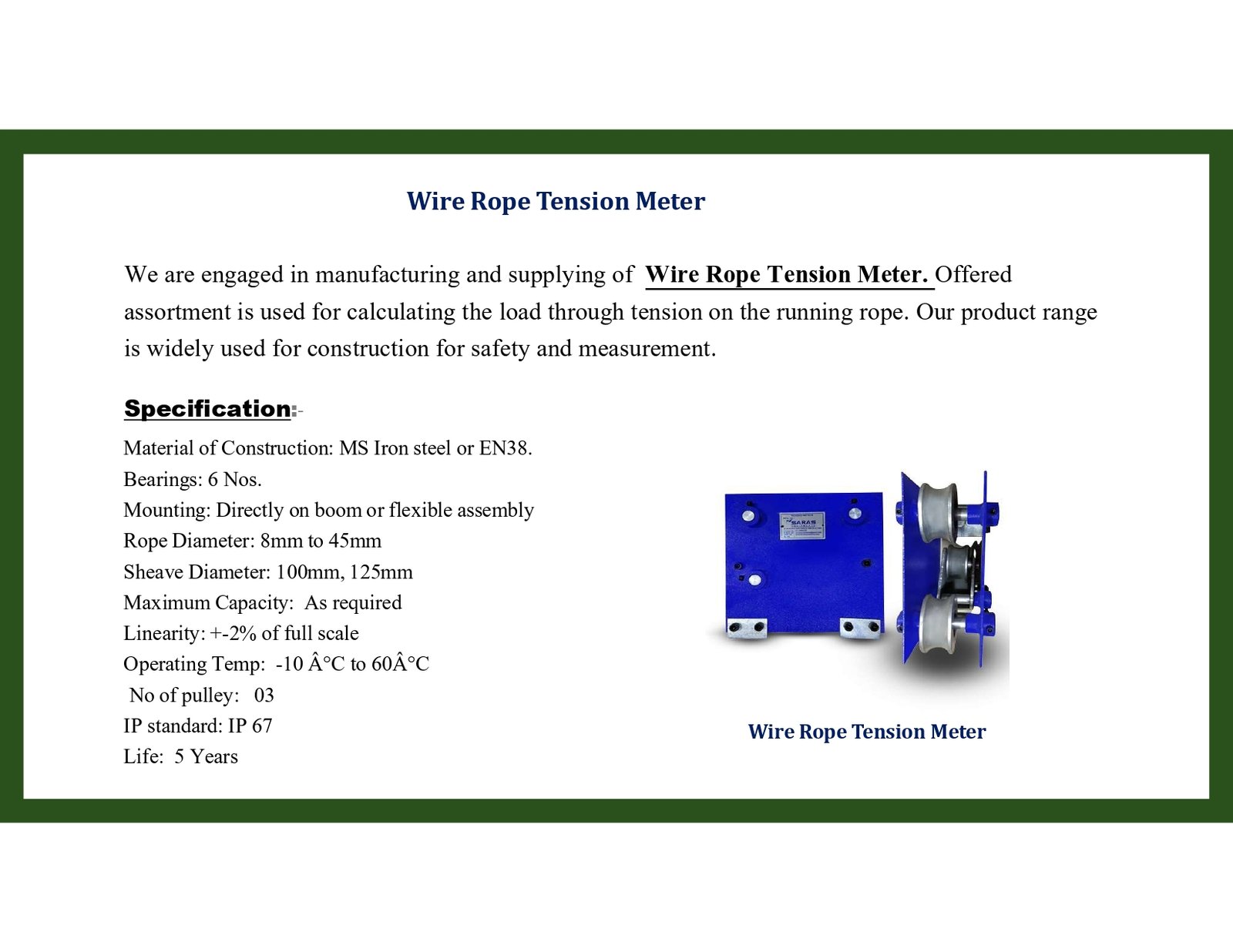 We are Engaged in Manufacturing and Supplying of Tension Meter for Cranes. Offered Assortment is used for Calculating the Load Through Tension On The Rope of the Crane. These Products Are an Indirect Way to Determine the Carry Load of the Cranes. Our product Range is Widely used for Construction Cranes for Safety.